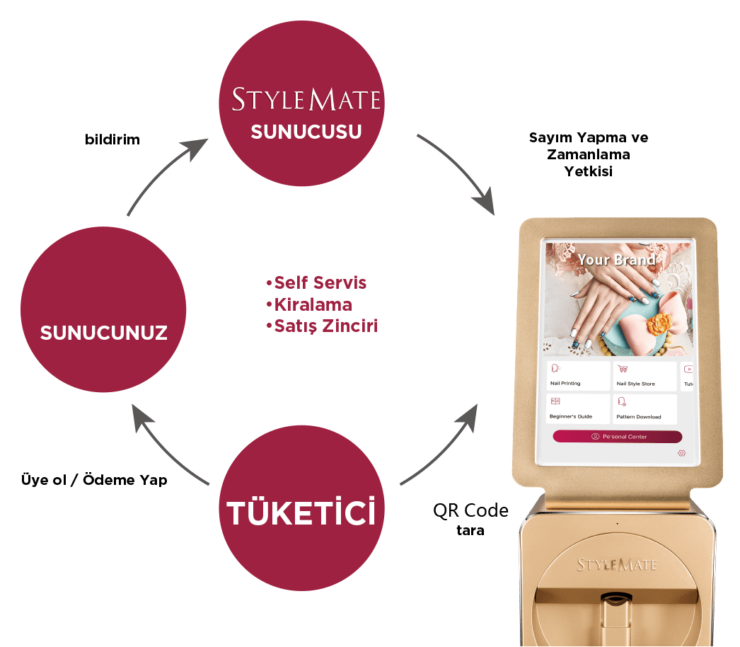 Tırnak üzerinde herhangi bir deseni basabilen küçük bir masaüstü akıllı tırnak cihazı. Ürün, yüksek kaliteli ticari tırnak sanat servisi için uygundur. Entegre cihazın ekranında STYLEMATE UYGULAMASI veya özelleştirilmiş UYGULAMA tarafından kontrol edilir.